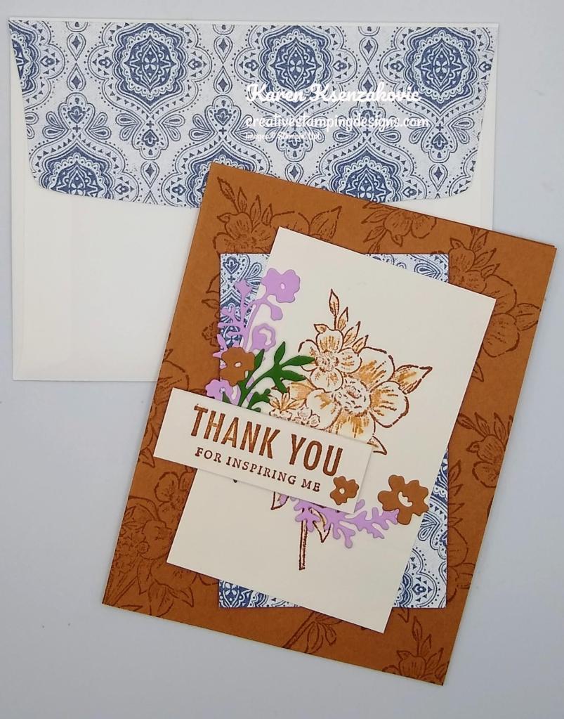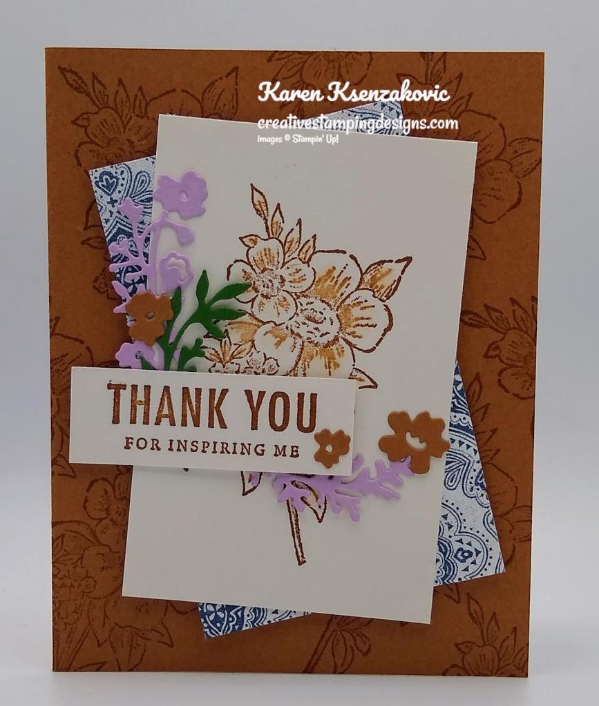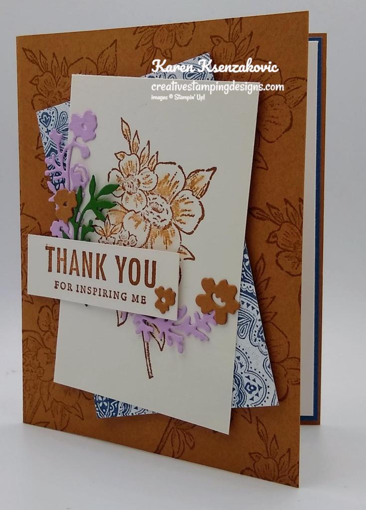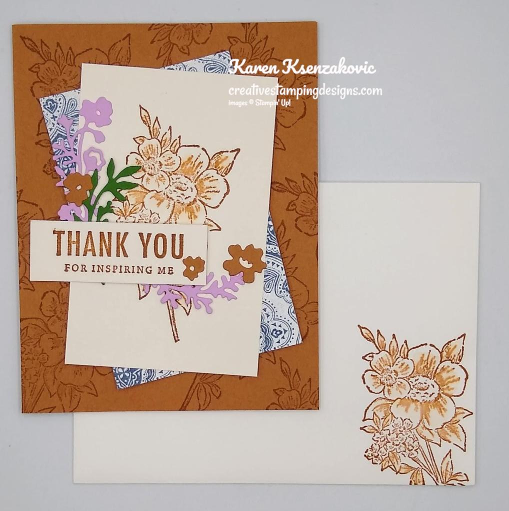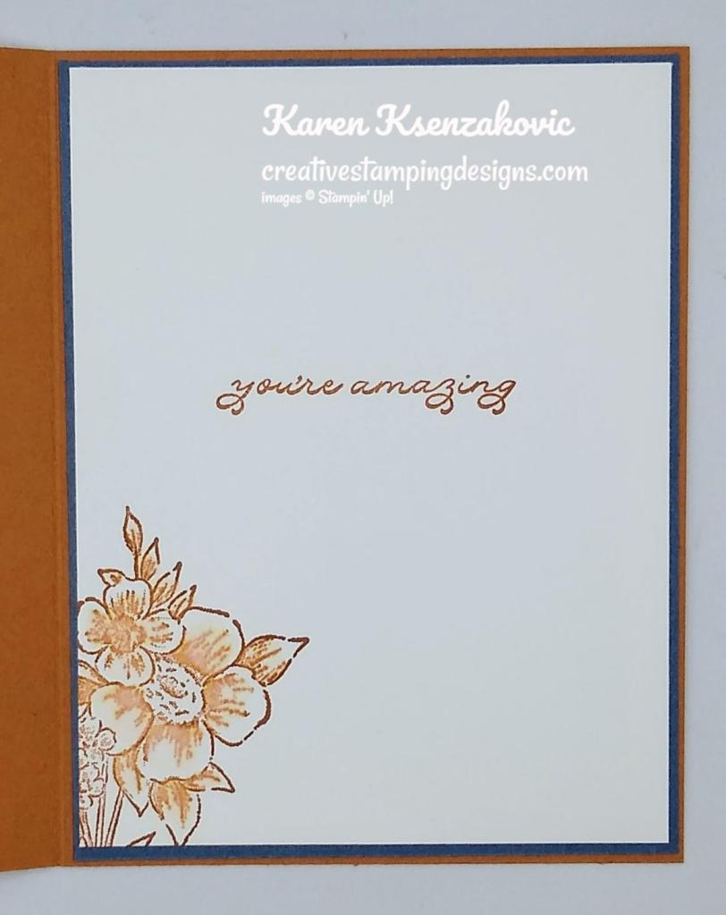 On the inside I stamped the sentiment from the Stampin’ Up! Ornate Thanks Photopolymer Stamp Set in Cinnamon Cider Ink on a Basic White panel. I stamped the smaller floral image from the Blessings of Home stamp set in Cinnamon Cider Ink, stamping off once, on either side of the sentiment. I adhered the Basic White panel to a Cinnamon Cider mat and then to the inside of the Fresh Freesia card base.