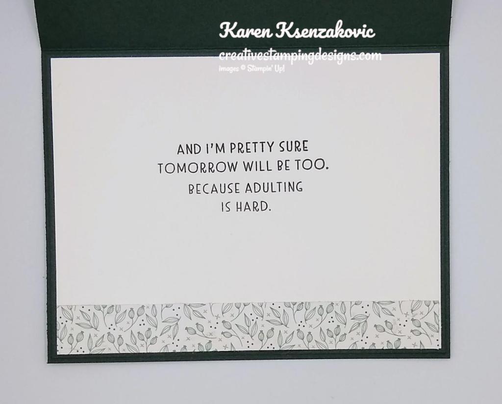 On the inside I stamped the sentiments from the Nothing’s Better Than stamp set in Early Espresso Ink on a Basic White panel. I adhered a strip of the Tidings of Christmas DSP to the bottom of the panel. I adhered the Basic White panel to an Evening Evergreen mat and then to the inside of the Evening Evergreen card base.