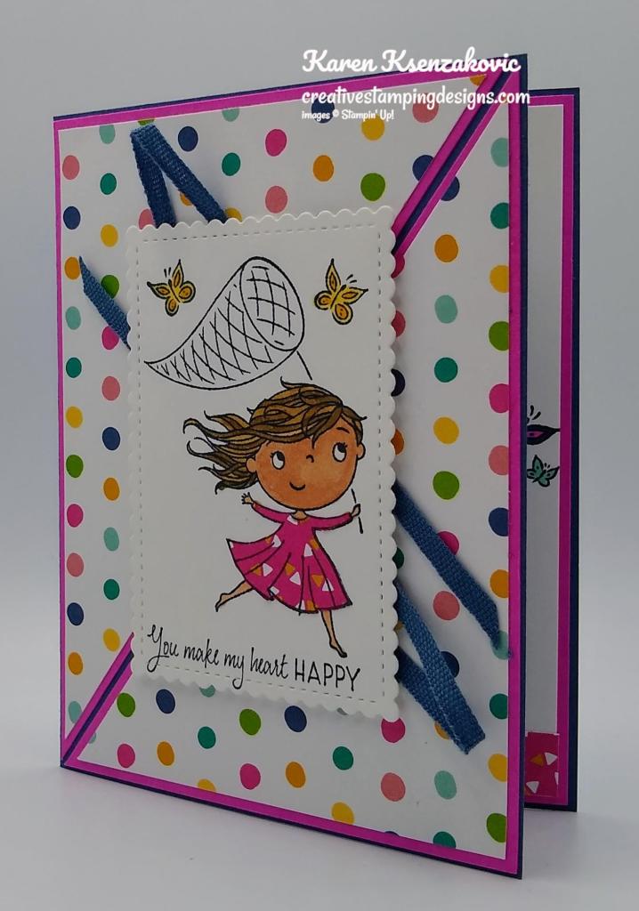 On a panel of Basic White cardstock I stamped the little girl and butterfly images from the Catching Butterflies stamp set in Tuxedo Black Ink. I colored the images in using my new SU300, SU500 and SU700 from the new Natural Tones Stampin’ Blends Collection. I stamped the little girl image from the Catching Butterflies on a small panel of Sunshine & Rainbows DSP and fussy cut the dress using my Paper Snips. I adhered the dress to the stamped image using Multipurpose Liquid Glue. I cut the image out using my Stitched So Sweetly Dies. I stamped the sentiment from the Catching Butterflies stamp set on the bottom of the panel in Tuxedo Black Ink.