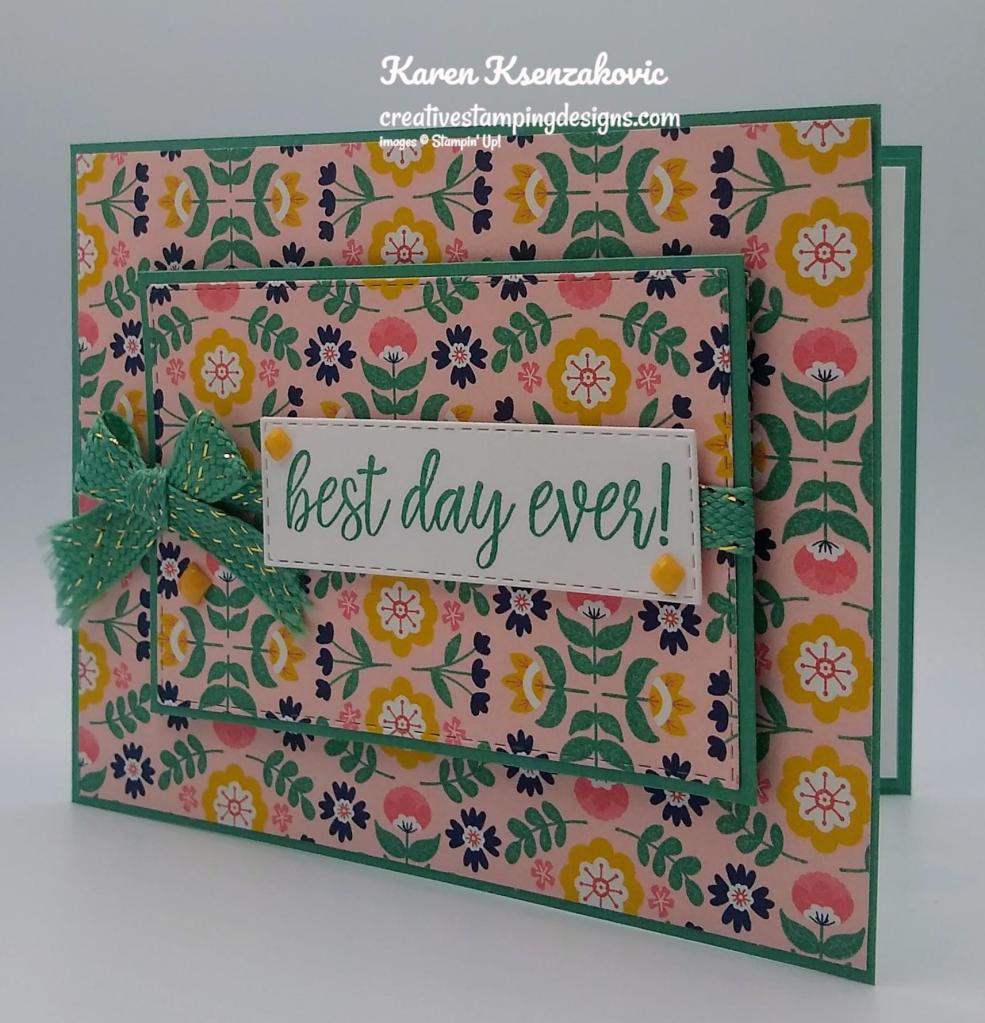 I adhered the cut panel of Sweet Symmetry DSP to a Just Jade mat using Stampin’ Seal. I wrapped a piece of the Just Jade & Gold 3/8″ Braided Ribbon around the layered panel and tied a bow on the side. I adhered the panel to the center of the card front, making sure to line up the flowers, using Stampin’ Dimensionals.