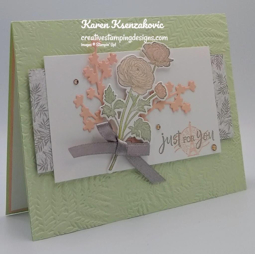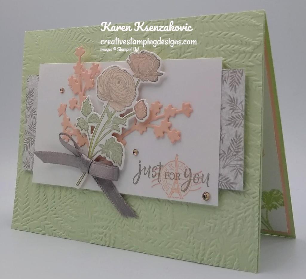 I used the Stampin’ Up! Ranunculus Romance Bundle along with the Bloom Where You’re Planted Designer Series Paper and the new Fern 3D Embossing Folder (available May 3rd) for my card today.