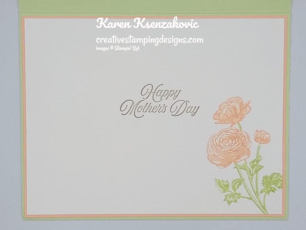 On the inside I stamped the sentiment from the Stampin’ Up! Celebrating You Cling Stamp Set in Gray Granite Ink on a Basic White panel. I colored the rose image stamp from the Ranunculus Romance stamp set using my Petal Pink and Soft Sea Foam Stampin’ Write Markers and stamped it on the bottom of the panel. I adhered the Basic White panel to a Petal Pink mat and adhered it to the inside of the Soft Sea Foam card base.