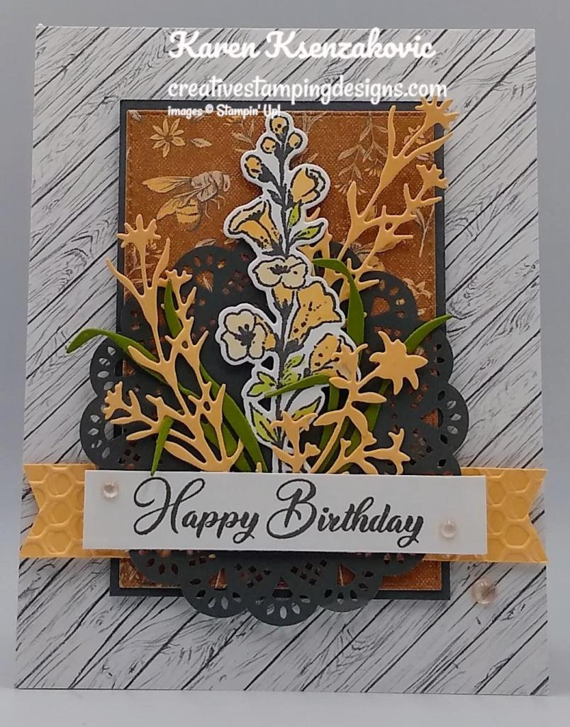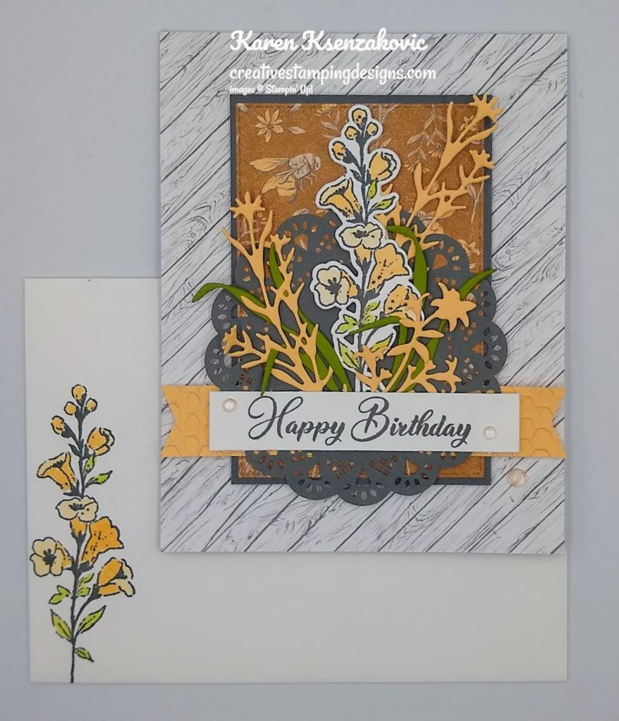 Using my Honeybee Blooms Dies I cut 3 of the floral dies from a panel of Pale Papaya cardstock. I cut 2 of the grass dies from a panel of Old Olive cardstock. I stamped the foxglove image from the Stampin’ Up! Honeybee Home Cling Stamp Set in Basic Gray Ink on a Basic White panel. I colored the image using my Old Olive and Pale Papaya Stampin’ Blends Markers and cut the image out using my Honeybee Blooms Dies. I embossed a strip of Pale Papaya cardstock using the Hive 3D Embossing Folder. I used my Banner Pick A Punch and made both sides into a banner. I adhered the strip to the card front using Multipurpose Liquid Glue. I adhered a Heart & Home Doilie over the strip using Multipurpose Liquid Glue.