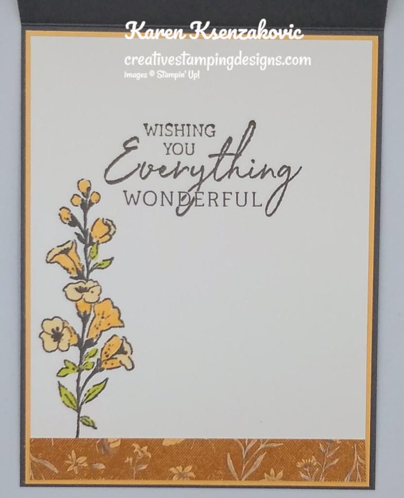 On the inside I stamped the sentiment from the Charming Sentiments stamp set in Basic Gray Ink on a Basic White panel. I stamped the foxglove image from the Honeybee Home stamp set in Basic Gray Ink on the bottom of the panel and colored it using my Old Olive and Pale Papaya Stampin’ Blends Markers. I adhered a strip of Heart & Home DSP to the bottom of the panel. I adhered the Basic White panel to a Pale Papaya mat and then to the inside of the Basic Gray card base.
