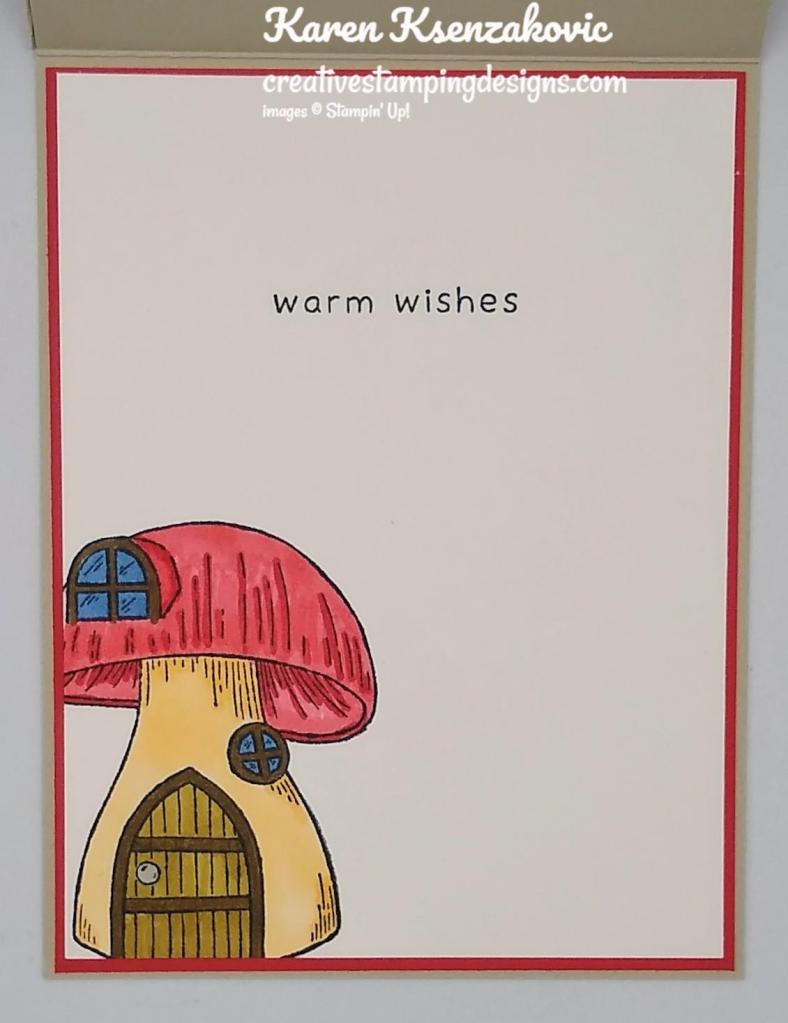 On the inside I stamped the sentiment from the Kindest Gnomes stamp set in Tuxedo Black Ink on a Basic White panel. I stamped it high so there was plenty of room to write. I stamped the mushroom house image from the Kindest Gnomes stamp set in Tuxedo Black Ink on the bottom of the panel. I colored the image using my Night of Navy, Pale Papaya, Poppy Parade, Smoky Slate and Soft Suede Stampin’ Blends Markers. I adhered the Basic White panel to a Poppy Parade mat and then to the inside of the Sahara Sand card base.