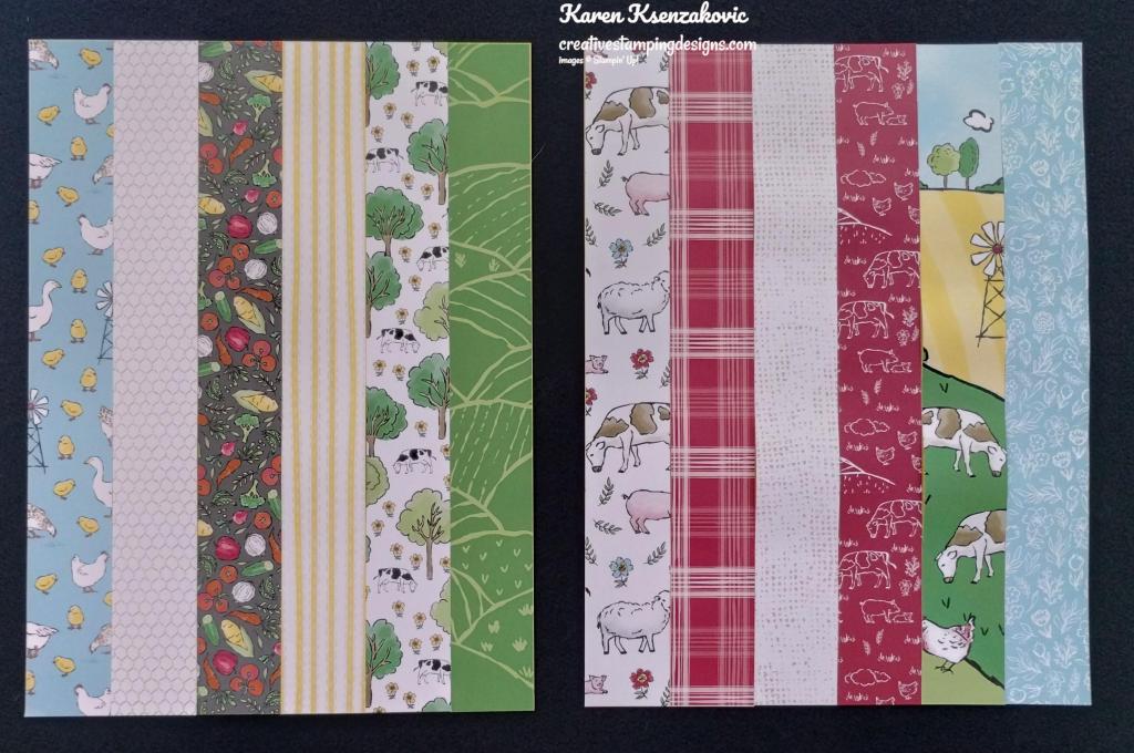 The Day at The Farm DSP coordinates with the On The Farm Bundle coming in the new mini catalog. Coordinating colors are Balmy Blue, Cherry Cobler, Daffodil Delight, Garden Green, Pear Pizzazz and Soft Suede.