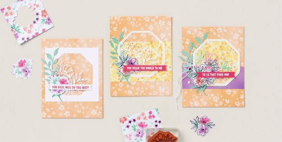 For the card in the middle: Adhere a panel of Bloom Impressions DSP to the front of a Peach Pie card base. Adhere another smaller panel of Bloom Impressions DSP to the center of the card front. Cut the greenery image from Shy Shamrock card stock with the Memorable Blooms Dies and adhere it to the card front. Cut a panel of Fluid 100 Watercolor Paper with the octagon frame and floral frame dies from the Memorable Blooms Dies and adhere it to the card front. Stamp the floral image from the Memorable Blooms stamp set in Blackberry Bliss ink over the floral image in the Bloom Impressions DSP. Cut the stamped image with the coordinating die from the Memorable Blooms Dies and adhere the flowers to the card front. Stamp the sentiment from the Memorable Blooms stamp set in VersaMark ink on a panel of Melon Mambo card stock, sprinkle it with white embossing powder from the Basics Wow! Embossing Powder and heat emboss it. Snip banner ends and adhere the sentiment to the card front.
