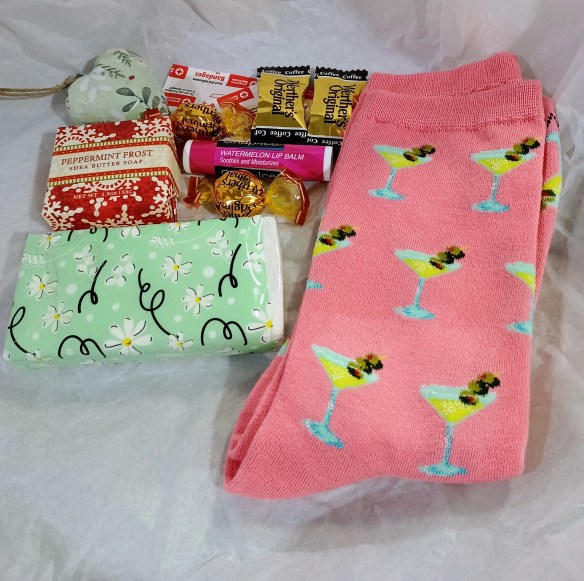 Linda put together another essential bag with Socks, Tissues, Lip Balm an Ornament, Peppermint Shea Butter Soap, Band-Aids and of course snacks.