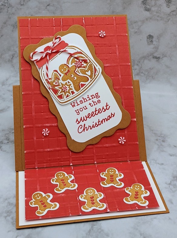 This adorable easel card was designed by Judi Hartbarger. Those gingerbread men are just too cute. Once we finished our cards, Judi had a little jar of mints for us as a little gift.