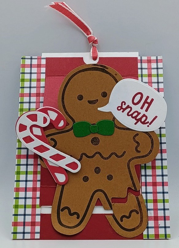 This adorable gingerbread man card is from my team member and friend Theresa. She had me for our ornament exchange and made me this cute card that slides open breaking the gingerbread man’s leg off.