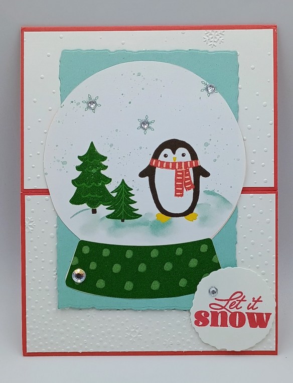 This cute penguin snow globe fun fold card is from my friend and team member Rosie. Right after I got her card in the mail, we had snow. I think she wished it on us.