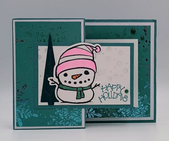 This adorable fun fold card was made by my friend and customer Pam. I think she knows how much I LOVE Lost Lagoon and Pretty Peacock. That little snowman is just too cute.