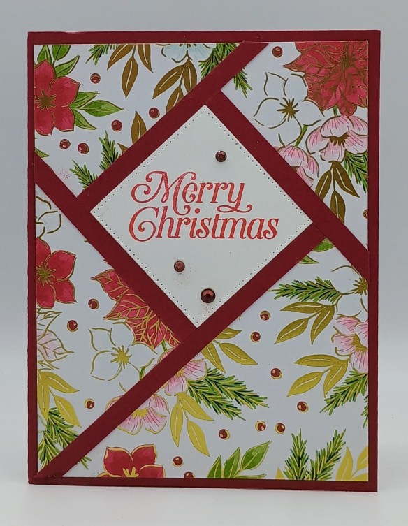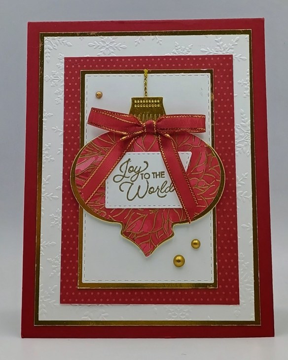 This absolutely stunning card was made by my friend and customer Gloria. I love the Cherry Cobbler and gold and look at all those layers!! Now that’s my kind of card and that ornament cut from the DSP is perfect.