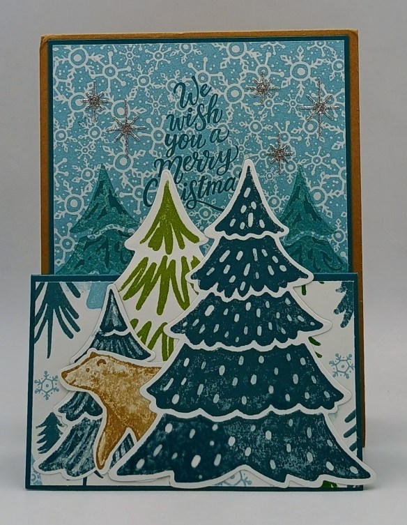 This fun easel card was made by my friend and customer Barbara. Love that little bear sneaking through the trees.