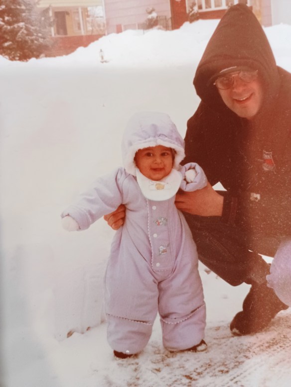 Good Snowy Monday morning stamping friends and welcome to a new week. We are under blizzard warning conditions here in NJ. So far, we have 15″ and it’s supposed to continue until 6pm tonight. No work today since only plows and emergency vehicles are allowed out. I let my pups out this morning, and they were buried, both of them are only about 20″ when standing on all 4’s. I saw that this is the 1st time in 30 years that we’ve had this bad of a blizzard warning. I thought I’d share this picture of 30 years ago when my son was 6-months old and this was his 1st snowstorm.
