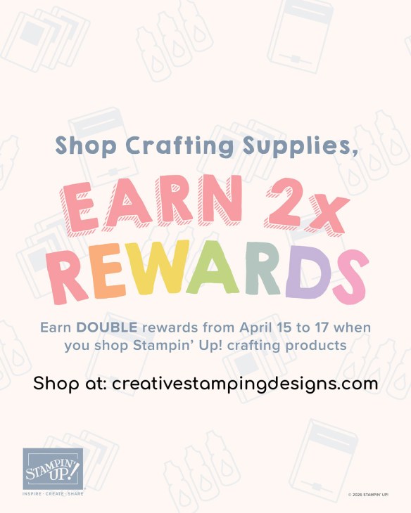 Stampin’ Up! just announced that they’ll be offering DOUBLE Stampin’ Rewards on all orders of $20+ placed between April 15-17!! Here are the details: