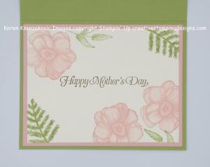 On the inside I stamped the flowers, ferns and leaves from the Painted Seasons stamp set randomly on a panel of Very Vanilla cardstock. I stamped the sentiment from the Stampin’ Up Strong And Beautiful Stamp Set in Soft Suede Ink in the center of the Very Vanilla panel. This stamp set has the most beautiful sentiments and font in it. I adhered the Very Vanilla panel to a Blushing Bride mat using Snail and then to the inside of the Pear Pizzazz card base using Multipurpose Liquid Glue.