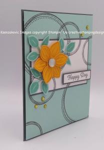 On a scrap of Mango Melody cardstock I stamped the flower image from the Stampin’ Up Floral Essence Photopolymer Stamp Set in Mango Melody Ink twice. I punched the flowers out using the Perennial Flower Punch. I adhered the flowers together using a Glue Dot and adhered it to the artwork panel using a Stampin’ Dimensional. I stamped the leaf image from the Floral Essence stamp set 3 times in Pool Party Ink on a scrap of Pool Party cardstock and punched them out using the Leaf Punch. I adhered the leaves under the flower using Glue Dots.