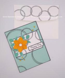 Decorate a Basic White Medium Envelope to finish the card. Stamp the flower, stamp and leaf images from the Impressions Abloom stamp set on the envelope front in Darling Duckling, Garden Green, Secret Sea, Strawberry Slush and Timid Tiger Inks the same as for the card. Stamp the hash image from the Happy Hibiscus stamp set in Darling Duckling Ink on the envelope flap.