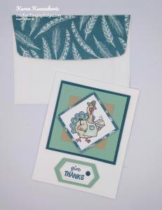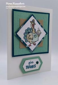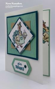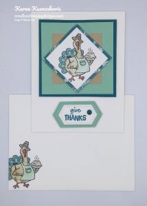 On the inside I stamped the sentiment from the Stampin’ Up! Country Home Photopolymer Stamp Set in Pretty Peacock Ink in the center of a Whisper White panel. I stamped the turkey image from the Birds of a Feather stamp set on the right of the sentiment peaking in and colored it the same as I did for the artwork on the card front. I adhered the Whisper White panel to a Mint Macaron mat using Snail and then to the inside of the Thick Whisper White card base using Multipurpose Liquid Glue.