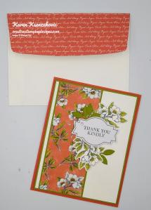 On the inside I stamped the sentiment from the Stampin’ Up! Ornate Thanks Photopolymer Stamp Set in Old Olive Ink in the center of a Basic White panel. I stamped the flower image from the Quiet Meadow stamp set in Tuxedo Black Ink, stamping off once. I colored the image in using my Flirty Flamingo and Soft Sea Foam Stampin’ Blends Markers. I stamped the splotch image from the Quiet Meadow stamp set in Soft Sea Foam Ink around the flower. I adhered the Basic White panel to an Old Olive mat using Stampin’ Seal and then to the inside of the Terracotta Tile card base using Stampin’ Seal.