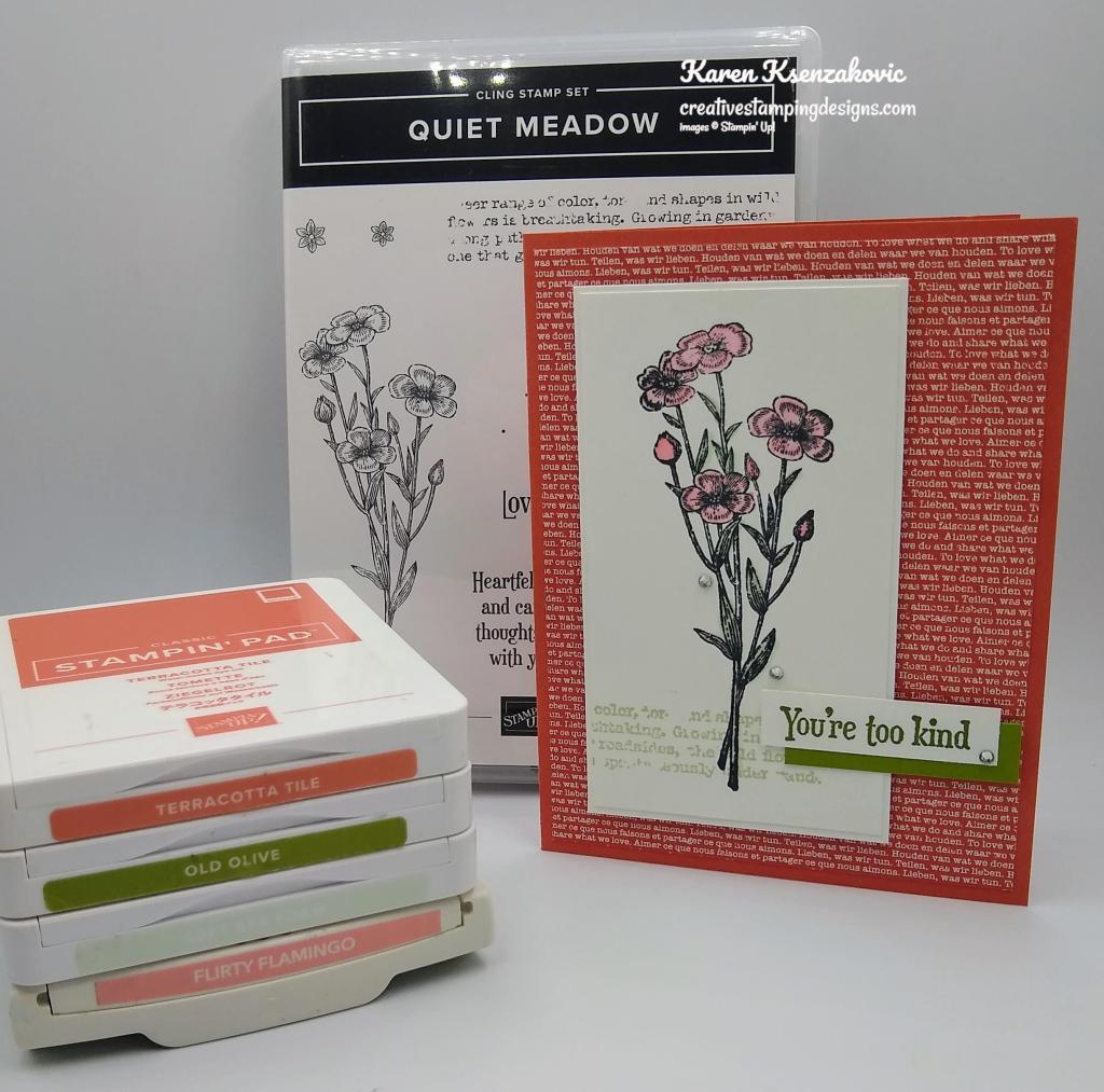 I used the new Stampin’ Up! Quiet Meadow Cling Stamp Set (available May 4th) for my card today. My colors are from the Fab Friday Challenge #212.