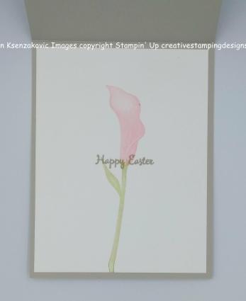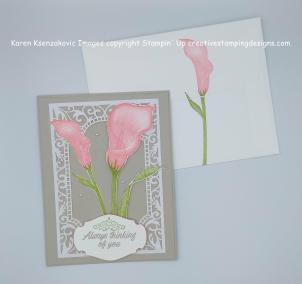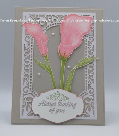 I adhered the smaller lily to the card front using Multipurpose Liquid Glue. I adhered the larger lily and the leaf using Stampin’ Dimensionals. I stamped the sentiment from the Stampin’ Up Accented Blooms Stamp Set in Sahara Sand Ink on a scrap of Whisper White cardstock. I stamped the scroll from the same stamp set above the sentiment in Granny Apple Green Ink. I punched the sentiment out using the Story Label Punch, (available for a limited time during the month of March), and edged it using my Flirty Flamingo Stampin’ Write Marker. I adhered the punched sentiment to the bottom of my card front using Stampin’ Dimensionals and I added a few Pearl Basic Jewels.