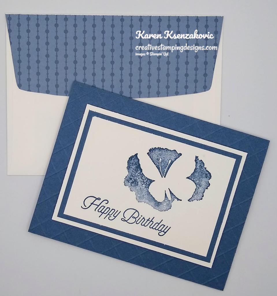 to complete my card, I decorated a Basic White Medium Envelope. I stamped the butterfly image from the Amazing Silhouettes stamp set on the envelope front in Blackberry Bliss Ink. I adhered a panel of Design A Daydream DSP to the envelope flap.