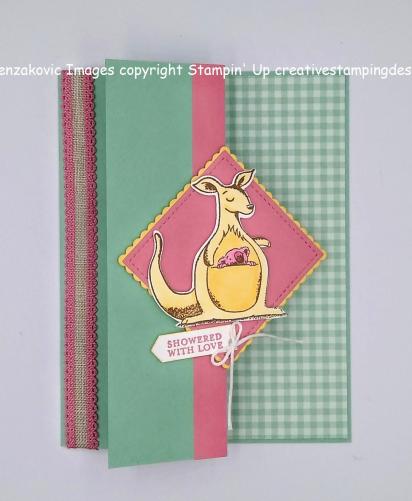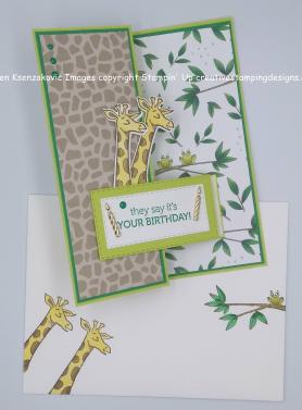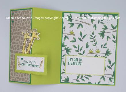 On the inside I stamped the sentiment from the Stampin’ Up! A Big Thank You Photopolymer Stamp Set in Soft Suede Ink in the center of a Whisper White panel. I stamped the giraffe image from the Animal Outing stamp set in Soft Suede Ink on the bottom of the panel and colored it in using my Daffodil Delight and Mango Melody Stampin’ Blends Markers. I adhered the Whisper White panel to a Pumpkin Pie mat using Snail and then to the inside of the Thick Whisper White card base using Multipurpose Liquid Glue.