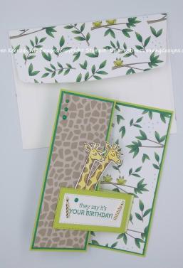 To finish my card I decorated a Medium Whisper White Envelope. I stamped the giraffe image from the Animal Outing stamp set in Soft Suede Ink on the bottom front of the envelope and colored it in using my Daffodil Delight and Mango Melody Stampin’ Blends Markers. I adhered a panel of the Mango Melody Brights 6 X 6 Designer Series Paper to the envelope flap.