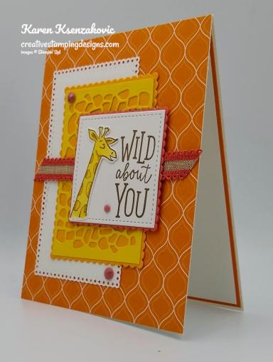 Using the giraffe pattern die from the Animal Friends Dies, I cut a Daffodil Delight panel twice. I adhered the die cut panel to a Mango Melody mat, which I cut using the Stitched So Sweetly Dies, using Multipurpose Liquid Glue. I adhered a piece of Terracotta Tile 1/2″ Scalloped Linen Ribbon across the middle of the panel using Snail. I cut a panel of Whisper White cardstock using the Ornate Layers Dies and then embossed it using the Subtle 3D Embossing Folder. I adhered a panel of Pumpkin Pie Regals 6 X 6 Designer Series Paper to a Thick Whisper White card base using Snail. I adhered the Whisper White die cut panel to the card front using Multipurpose Liquid Glue. I adhered the matted die cut panel on top of the Whisper White panel using Glue Dots and the artwork on top of the matted die cut panel using Stampin’ Dimensionals. I added a few Terracotta Tile 2019-2021 In-Color Faceted Dots to the card front.