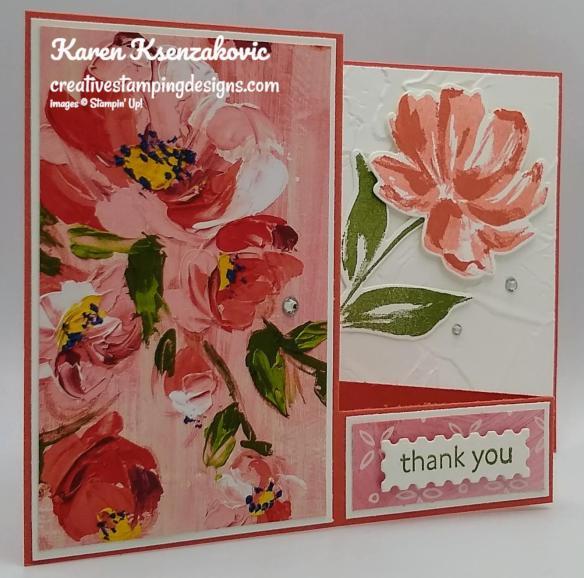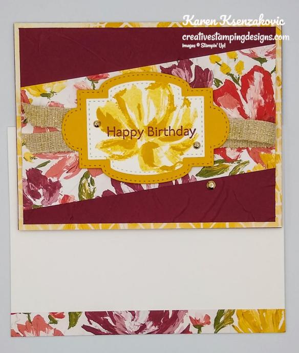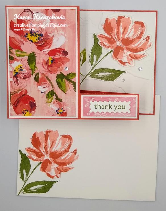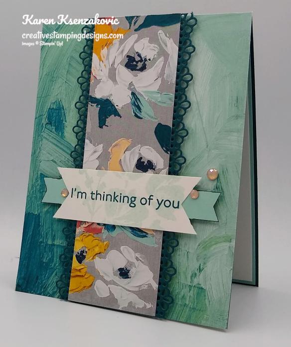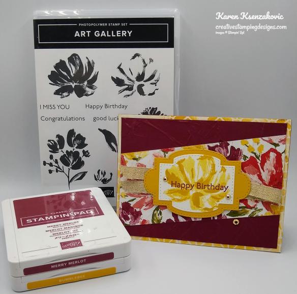 I used the Stampin’ Up! Art Gallery Photopolymer Stamp Set along with the 2022-2024 In-Color 6 X 6 Designer Series Paper (available May 3) and the Brushstroke Specialty Paper (available May 3) for my Clean and Layered card. I was inspired by the flowers on the pillow and the colors from the photo.