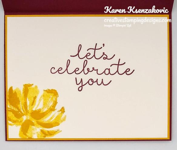 On the inside I stamped the sentiment from the Stampin’ Up! Celebrating You Cling Stamp Set in Pear Pizzazz Ink on a Very Vanilla panel. I stamped the smaller flower image from the Art Gallery stamp set in Blushing Bride Ink above and below the sentiment. I tore the edges of the panel and sponged them with some Soft Suede Ink. I adhered the Very Vanilla panel to a Blushing Bride mat and then to the inside of the Soft Suede card base.