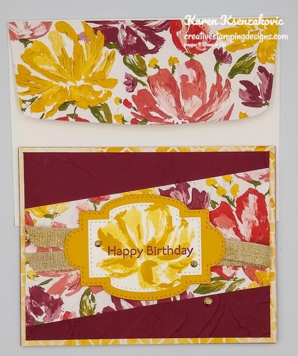 To complete my card, I decorated a Very Vanilla Medium Envelope. I stamped the flower image from the Art Gallery stamp set on the envelope front the same as I did for the card front. I adhered a panel of the 2022-2024 In-Color DSP to the envelope flap.