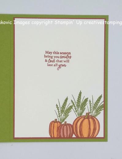 On the inside I stamped the sentiment from the Gather Together stamp set in Basic Gray Ink to the center of a Very Vanilla panel. I stamped the small leaf image from the Stampin’ Up Colorful Seasons Photopolymer Stamp Set in Cajun Craze, Pumpkin Pie and So Saffron Ink to the bottom of the panel. I adhered the Very Vanilla panel to the inside of a Basic Gray card base using Multipurpose Liquid Glue.
