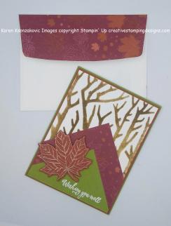 To finish my card I decorated a Medium Very Vanilla Envelope. I stamped the small leaf image from the Colorful Seasons stamp set across the bottom front of the envelope in Cajun Craze, Pumpkin Pie and So Saffron Inks. I used the Basic Pattern Decorative Masks on the envelope flap and colored it the same as I did for the card front.