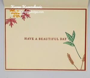 On the inside I stamped the pumpkin images from the Gather Together stamp set in Cajun Craze Ink on the bottom of a Very Vanilla panel using the masking technique and colored them in using my Mint Macaron, Pumpkin Pie and Soft Suede Stampin’ Blends Markers. I stamped the wheat image from the Gather Together stamp set in Mint Macaron Ink by the pumpkins. I stamped the leaf image from the Beautiful Autumn stamp set in Pumpkin Pie Ink on the bottom of the panel. I stamped the sentiment from the Autumn Goodness stamp set in Early Espresso Ink in the center of the panel. I adhered the Very Vanilla panel to a Cajun Craze mat using Stampin’ Seal and then to the inside of the Mint Macaron card base using Multipurpose Liquid Glue.