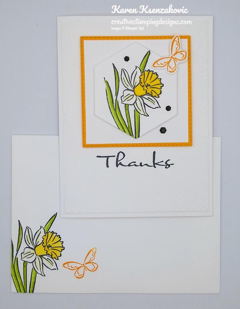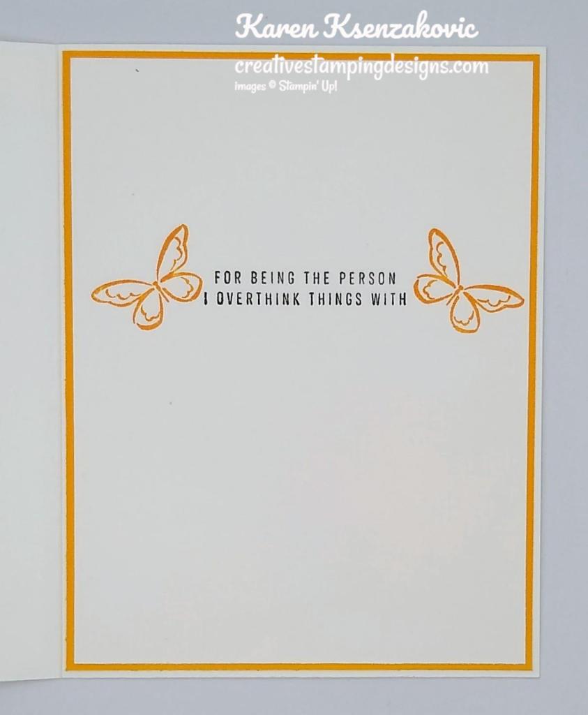 On the inside, I stamped the sentiment from the Honeybee Home stamp set in Wild Wheat Ink on a panel of Basic White. I stamped the 3 bees from the Honeybee Home stamp set in Tuxedo Black Ink by the sentiment and on the bottom of the panel. I colored the bees using my Wild Wheat Stampin’ Blends Markers. I adhered the Basic White panel to a Basic Black mat then to the inside of the Wild Wheat card base.