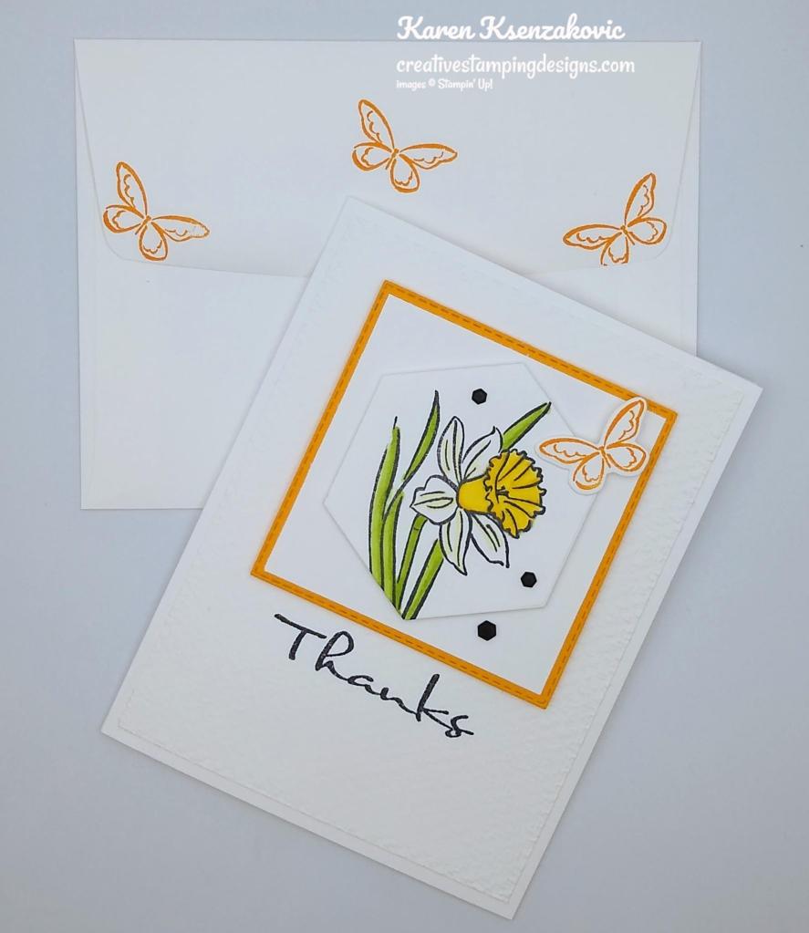 To finish my card, I decorated a Basic White Medium Envelope. I stamped the large bee from the Queen Bee stamp set on the envelope front in Tuxedo Black Ink. I stamped the 3 smaller bees from the Honeybee Home stamp set in Tuxedo Black Ink on the envelope flap. I colored all the bees in using my Wild Wheat Stampin’ Blends Marker.