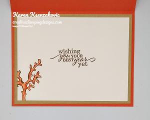 On the inside I stamped the sentiment from the Stampin’ Up! Best Year Cling Stamp Set in Misty Moonlight Ink on a Basic White panel. I adhered a strip of the Tidings of Christmas DSP to the bottom of the panel. I adhered the Basic White panel to a Cherry Cobbler mat and then to the inside of the Misty Moonlight card base.
