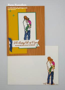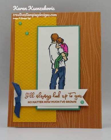 On the inside I stamped the sentiment from A Good Man stamp set in Cinnamon Cider Ink in the center of a Whisper White panel. I stamped the sentiment from the Stampin’ Up! Best Year Cling Stamp Set in Cinnamon Cider Ink below the 1st one. I stamped the father/daughter image from A Good Man stamp set in Cinnamon Cider Ink, stamping off twice, over the sentiments. I adhered a strip of the 2020-2022 In-Color 6 X 6 DSP to the bottom of the panel using Stampin’ Seal. I adhered the Whisper White panel to a Just Jade mat using Stampin’ Seal and then to the inside of the Cinnamon Cider card base using Multipurpose Liquid Glue.