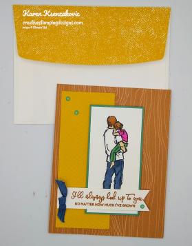 To finish my card I decorated a Medium Whisper White Envelope. I stamped the father/daughter image from A Good Man stamp set in Cinnamon Cider Ink on the envelope front and colored it in using my Cinnamon Cider, Ivory, Just Jade, Magenta Madness and Misty Moonlight Stampin’ Blends Markers. I adhered a panel of the 2020-2022 In-Color 6 X 6 DSP to the envelope flap.