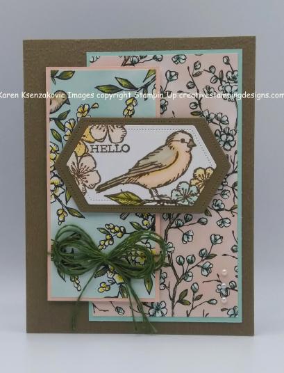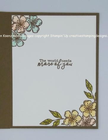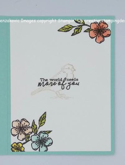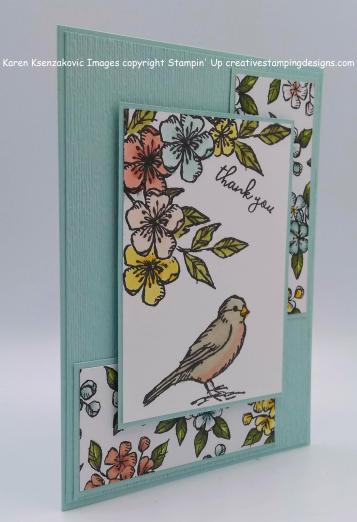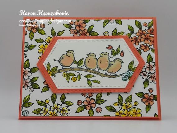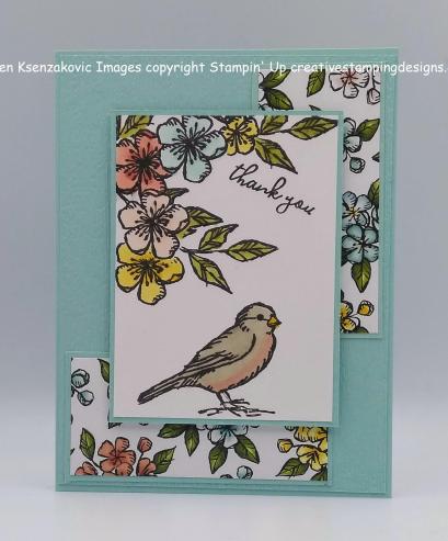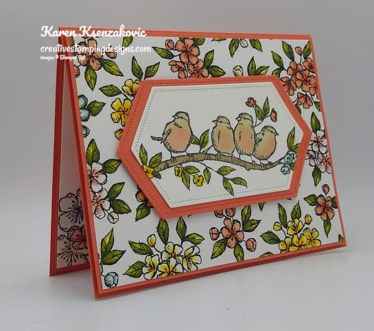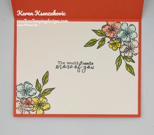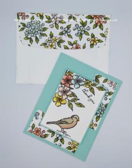 I adhered 2 panels of Bird Ballad Designer Series Paper to the 2 inside fold panels. To keep with the colors, I colored the leaves and flowers on the DSP using my Granny Apple Green and Melon Mambo Stampin’ Write Markers.