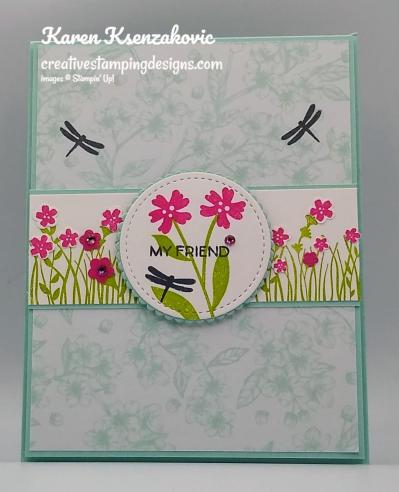 On another small panel of Whisper White cardstock I stamped the sentiment from the Field of Flowers stamp set in Tuxedo Black Memento Ink. I stamped the larger stem image from the Field of Flowers stamp set in Granny Apple Green Ink over the sentiment. I stamped the single flower image from the Field of Flowers stamp set in Melon Mambo Ink on the stems. I stamped the dragonfly image from the Field of Flowers stamp set in Tuxedo Black Memento Ink below the sentiment and a couple times on the DSP. I cut the sentiment out using the 2nd smallest circle from the Stitched Shapes Dies. I cut a scalloped circle out of Pool Party cardstock using the Layering Circles Dies that was a size larger than the stitched circle. I adhered the stitched circle to the scalloped circle using Snail and then on top of the artwork strip using Stampin’ Dimensionals. I added a few Melon Mambo Noble Peacock Rhinestones to the artwork.