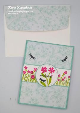 To finish my card I decorated a Medium Whisper White Envelope. I stamped the stem image from the Field of Flowers stamp set in Granny Apple Green Ink on the envelope front. I stamped the flower images from the Field of Flowers stamp set in Melon Mambo Ink on top of the stems. I stamped the dragonfly image from the Field of Flowers stamp set in Tuxedo Black Memento Ink near the flowers. I adhered a panel of the Parisian Blossoms Specialty DSP to the envelope flap.