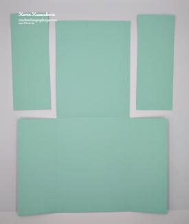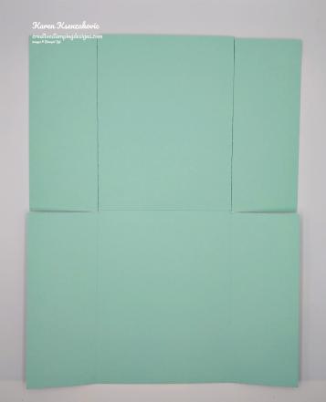 I started with an 8 1/2″ X 11″ panel of Pool Party cardstock. I scored it in half at 5 1/2″. I turned the panel the long way and scored it at 2 1/8″ & 6 3/8″. It should look like the photo below.
