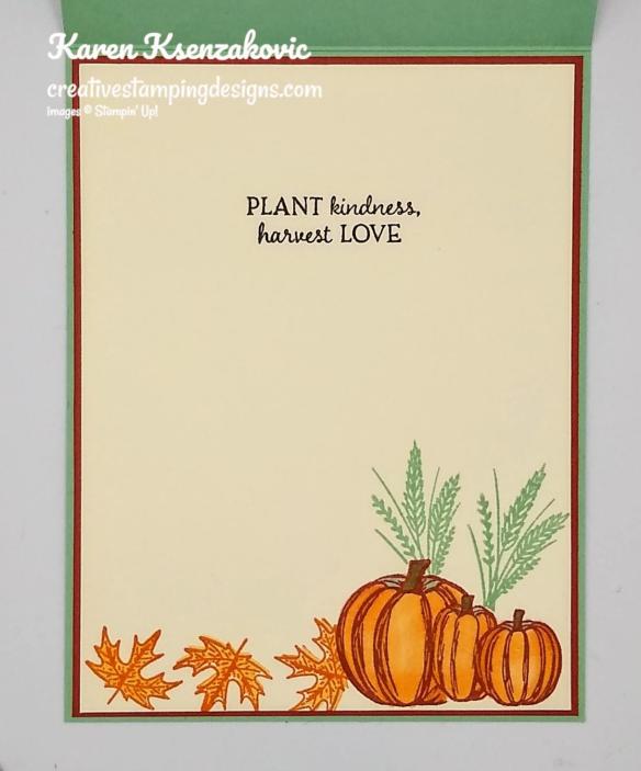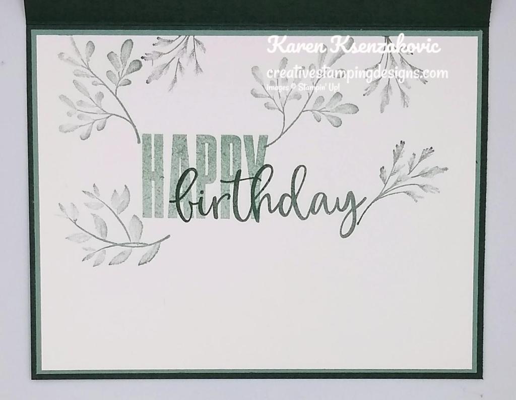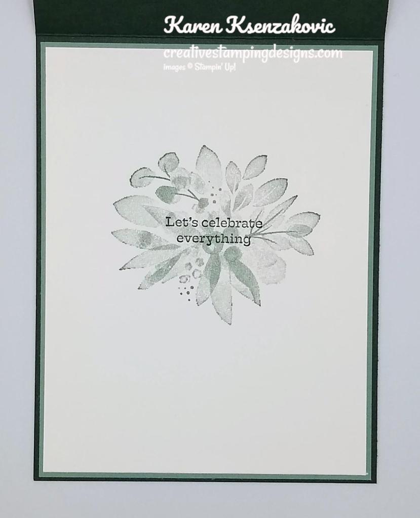 On the inside I stamped the floral image from the Eden’s Garden stamp set in Soft Succulent Ink in the center of a Basic White panel. I stamped the sentiment from the Eden’s Garden stamp set in Evening Evergreen Ink on top of the floral image. I adhered the Basic White panel to a Soft Succulent mat and then to the inside of the Evening Evergreen card base.