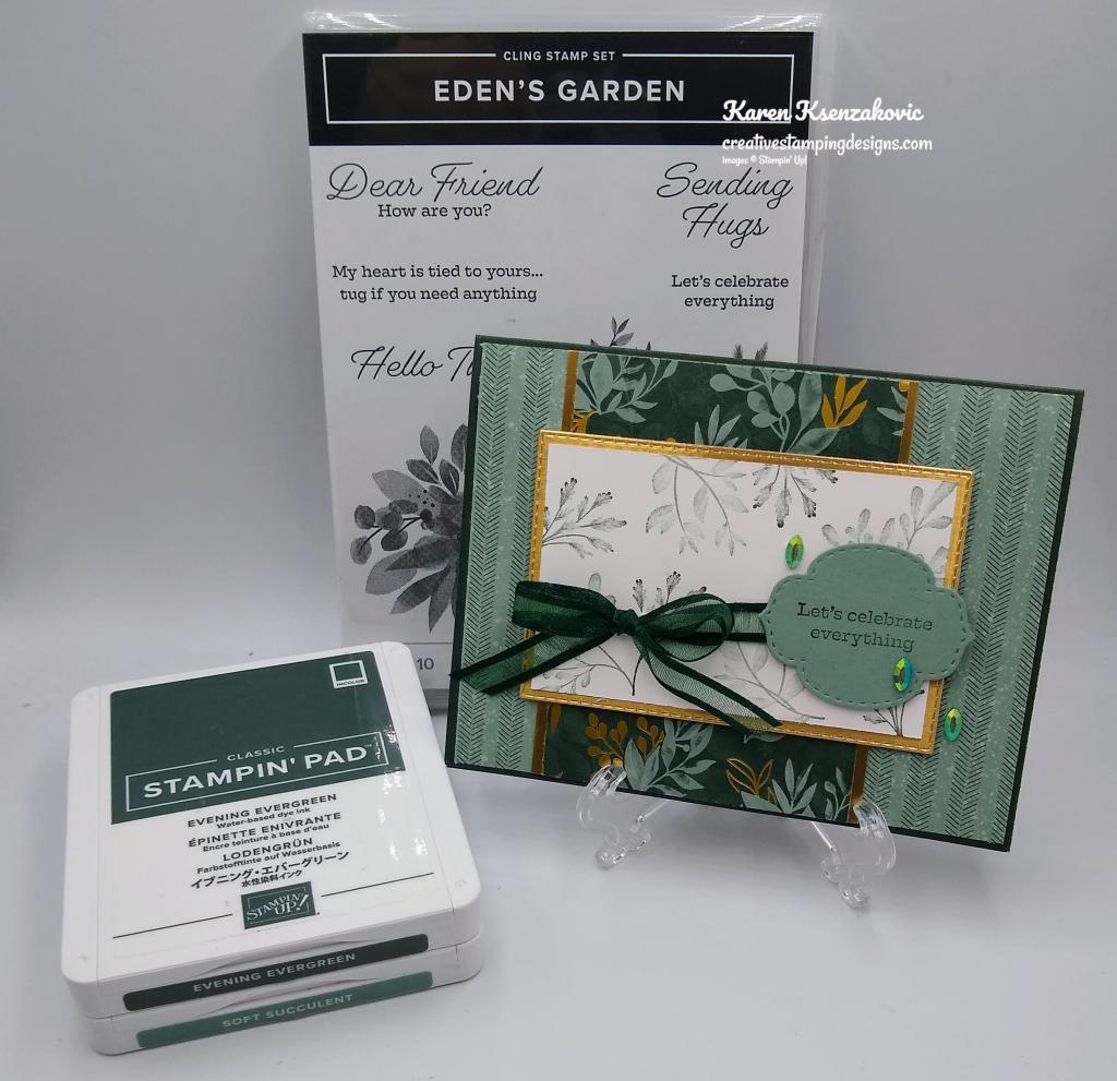 I used the Stampin’ Up! Eden’s Garden Cling Stamp Set along with the Ever Eden DSP for my card today.