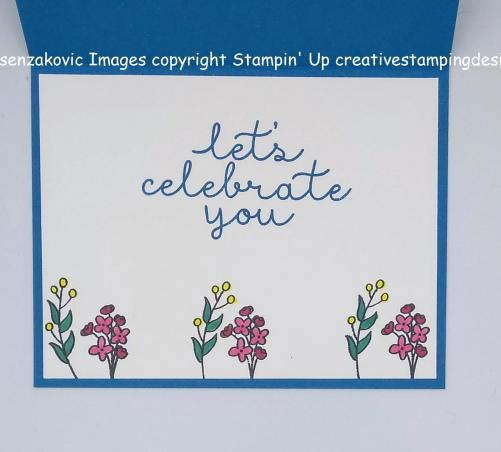 On the inside I stamped the smaller floral images from the Bloom & Grow stamp set in Tuxedo Black Memento Ink along the bottom of a Whisper White panel. I colored the images in using my Bermuda Bay, Lovely Lipstick and Pineapple Punch Stampin’ Blends Markers. I stamped the sentiment from the Bloom & Grow stamp set in Pacific Point Ink in the center of the panel. I adhered the Whisper White panel to the inside of the Pacific Point card base using Multipurpose Liquid Glue.