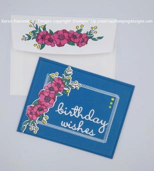To finish my card I decorated a Medium Whisper White Envelope. I stamped the large rectangle image from the Swirly Frames stamp set in Pacific Point Ink on the envelope front so that I could write the address in the center of it. I stamped the large floral image from the Bloom & Grow stamp set on the envelope flap and colored it in the same as I did for the card.